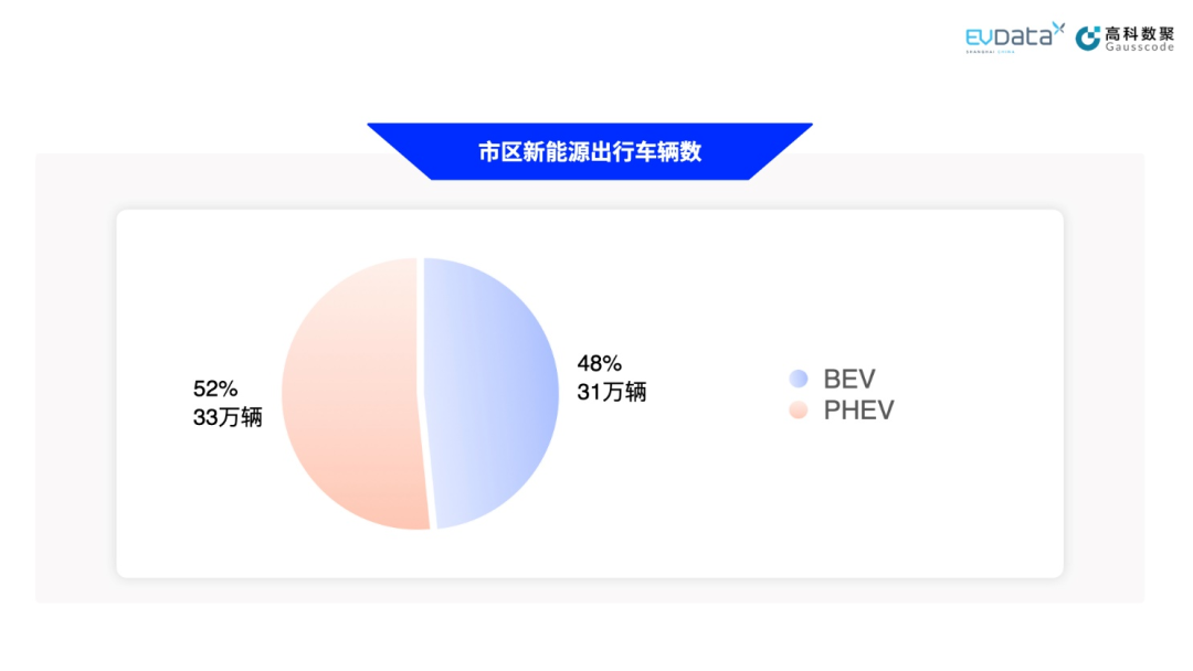 五一期间,数据中心选取了4月27日至5月3日的车辆运行数据进行分析和展示。期间约有71万辆新能源汽车出行,其中BEV约34万辆,占比48%,PHEV约有37万辆,占比52%。