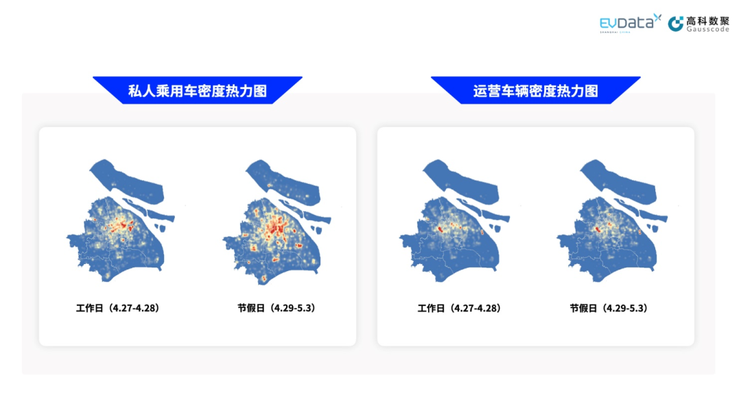 私人乘用车从工作日到节假日出现明显的流向变动。在工作日期间,各产业基地和中心城区的商务区出现了代表高度聚集的红色块斑;而在节假日期间车辆流向转移至各主要景点、中心城区的商业区和五大新城的商业区,上述区域都呈现了代表聚集的红色块斑。
